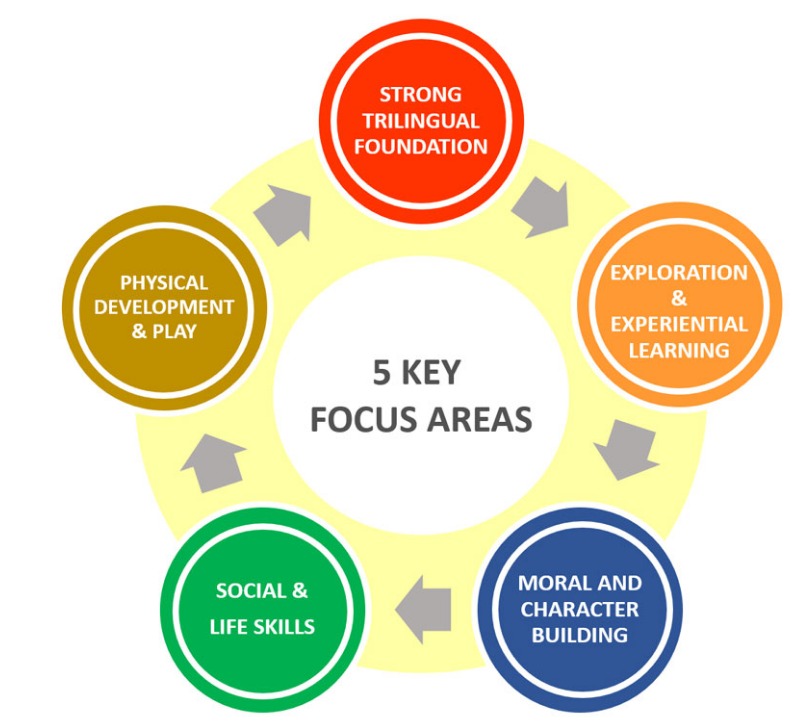 We have equal emphasis on 5 Key Focus Areas: STRONG TRILINGUAL FOUNDATION, EXPLORATION & EXPERIENTIAL LEARNING, 3) MORAL AND CHARACTER BUILDING, 4) SOCIAL & LIFE SKILLS and 5) PHYSICAL DEVELOPMENT & PLAY