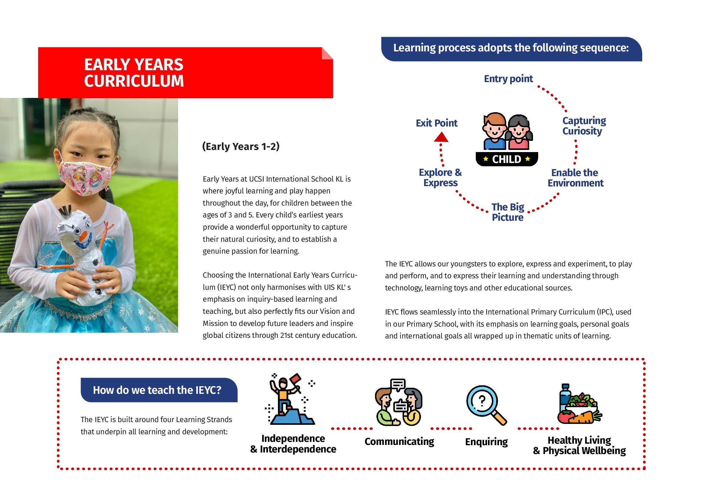 Choosing the International Early Years Curriculum (IEYC) not only harmonises with UCSI International School Kuala Lumpur’s emphasis on inquiry-based learning and teaching, but also perfectly fits our Vision and Mission to develop future leaders and inspire global citizens through 21st Century Education.